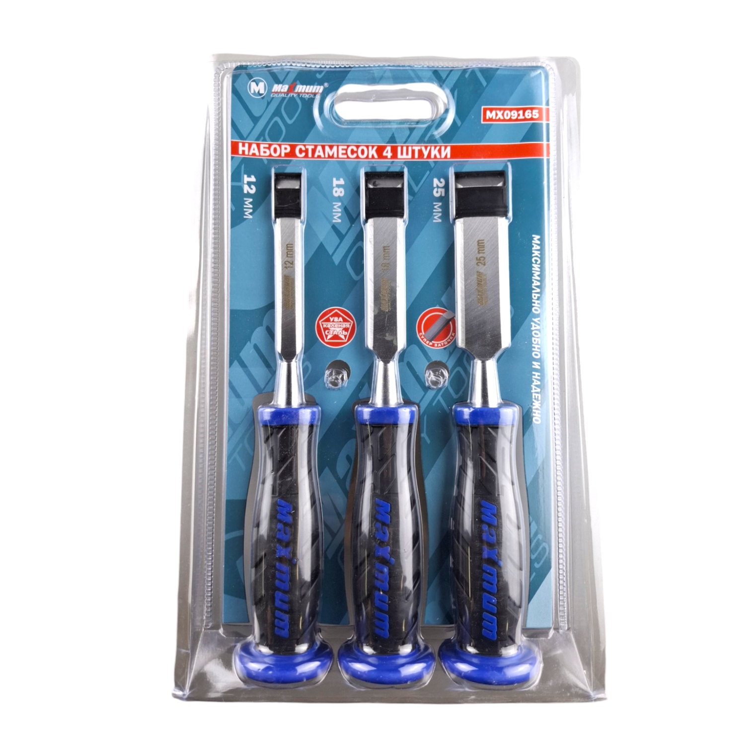 В комплект входит три стамески шириной 12, 19 и 25 мм.